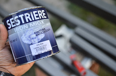 Un'altra opera in corso è la rimozione del vecchio pergolato ultratrentennale ormai marcio. Ci siamo fatti portare pali d'acciaio da 8 e 5 cm di larghezza, li abbiamo sgrassati con petrolio bianco, poi li abbiamo verniciati a mano con rullo e smalto antichizzato di alta qualità.