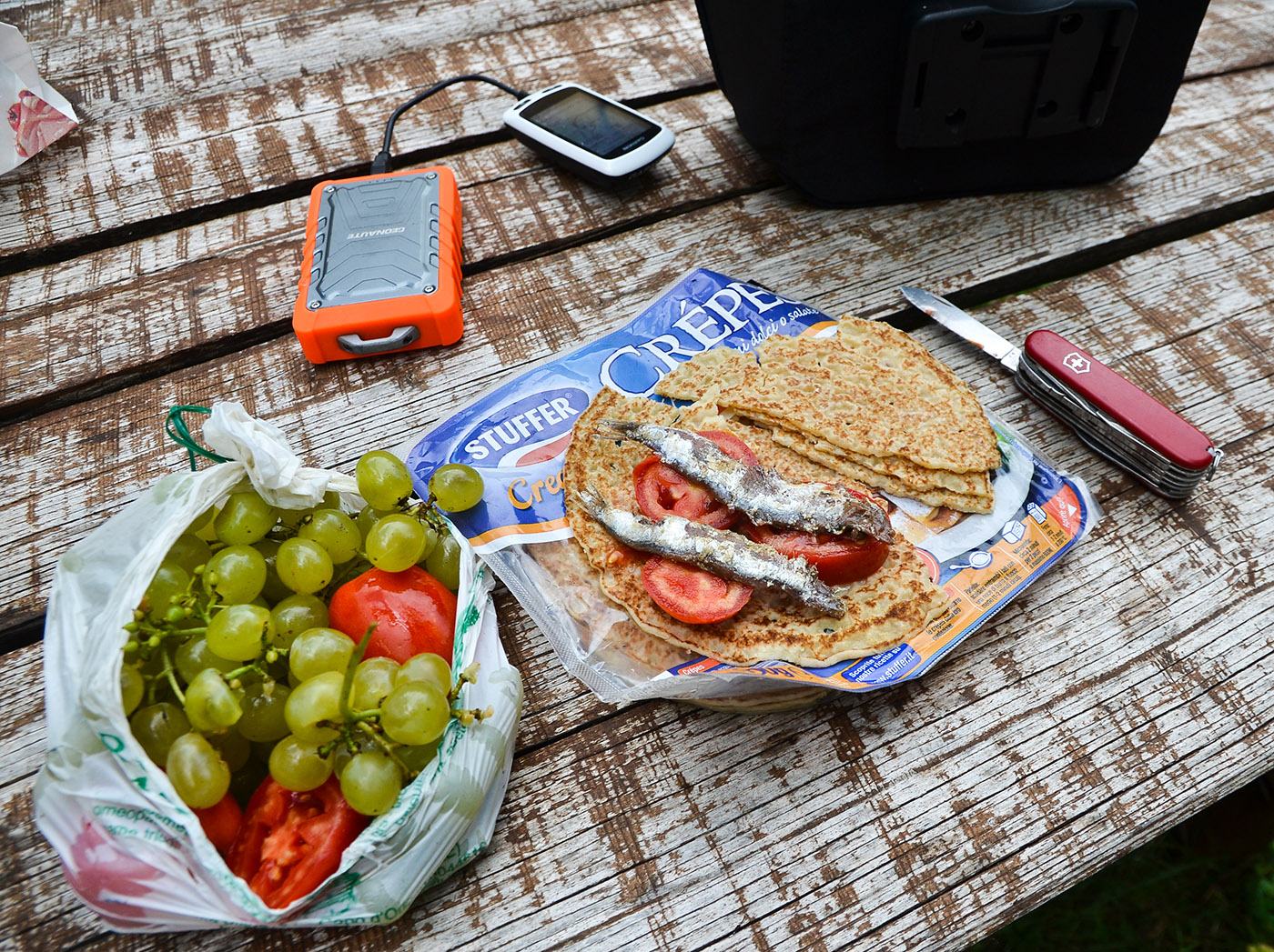 Il mio pranzo è consistito in: piadina di produzione del Trentino con pomodori e acciughe salate, più uva della mia campagna - un po' malridotta a seguito del trasporto.